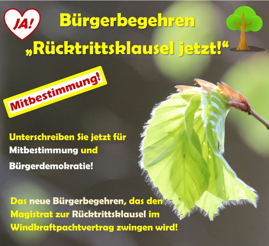 Wir von den BIs haben immer eine Bürgerbeteiligung und einen Bürgerentscheid gefordert. Nun hat tatsächlich der Magistrat bekannt gegeben, nach Beschluss der Stadtverordnetenversammlung (am 30.01.2025) 8 Wochen mit der Unterzeichung des Pachtvertrags mit der Windkraftfirma „wpd  Windpark Nr. 955 GmbH & Co. KG (WPD)“ mit Sitz in Bremen zu warten.