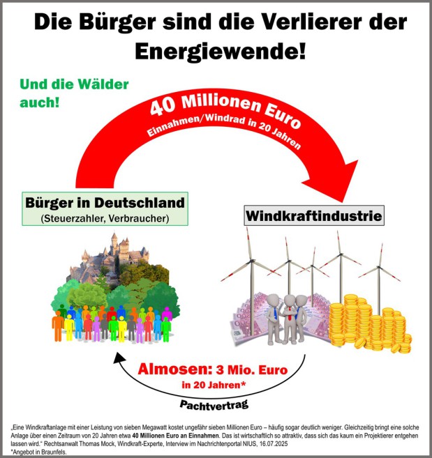 „Es hat ja eine große Leistungsexplosion gegeben bei den Windanlagen von inzwischen sechs bis acht Megawatt. Und die bekommen in 20 Jahren eine Vergütung von etwa 40 Millionen Euro (Anm. Verfasser: pro WEA!), gerechnet anhand der EEG-Vergütung, die in NRW üblicherweise gezahlt wird. Eine Windkraftanlage mit einer Leistung von sieben Megawatt kostet ungefähr sieben Millionen Euro – häufig sogar deutlich weniger. Gleichzeitig bringt eine solche Anlage über einen Zeitraum von 20 Jahren etwa 40 Millionen Euro an Einnahmen. Das ist wirtschaftlich so attraktiv, dass sich das kaum ein Projektierer entgehen lassen wird.“